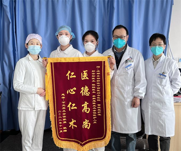 近日,患者甘婆婆的家屬激動地將一面印有“醫(yī)德高尚 仁心仁術”的錦旗送到成都東部新區(qū)中西醫(yī)結合醫(yī)院重癥醫(yī)學科主任彭世彬手中,感謝醫(yī)護人員對其母親就住重癥醫(yī)學科期間的精心救治和無微不至的護理。
