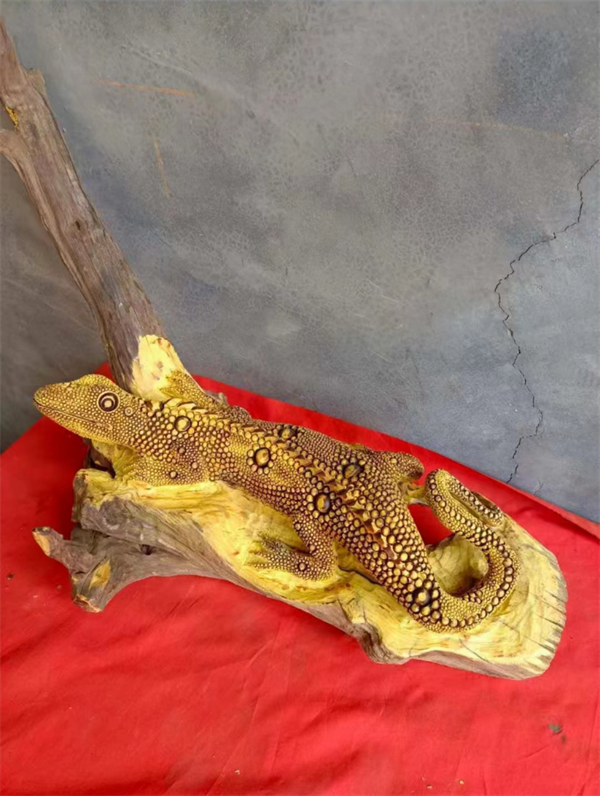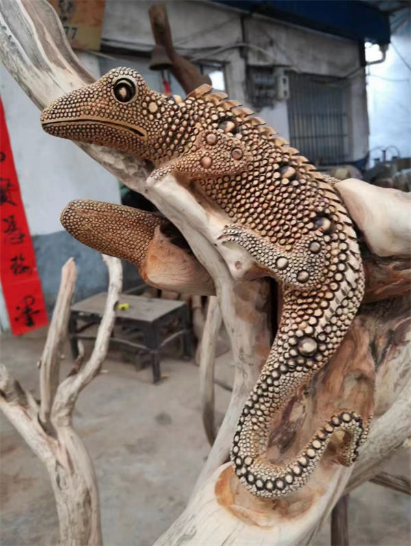 2023年6月26日,來到位于河南省平頂山市一體化示范區(qū)滍陽鎮(zhèn)幸福村彭國亮的文化工作室,彭國亮正在聚精會神地精心雕刻最新作品《吉祥吸億》。該作品以蜥蜴的形態(tài)為題材進行雕刻。雕刻手法嫻熟,這雕刻出來的蜥蜴那是一個活靈活現(xiàn),蜥蜴的獨特的生理特征也是雕刻的生動形象,展現(xiàn)出了蜥蜴的活力。蜥蜴古有“土龍”的美稱,寓意視野興隆,兼具平安的美意。