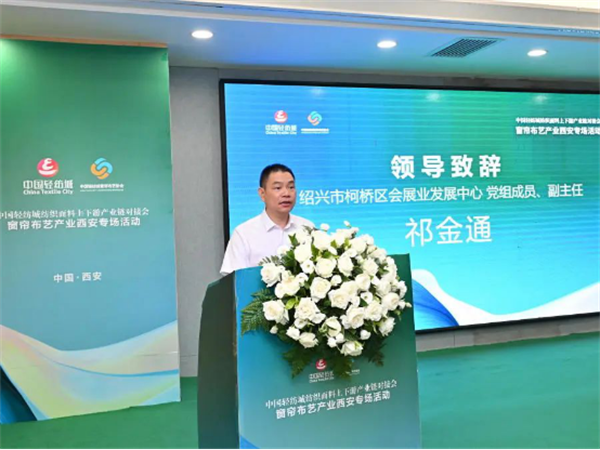 紹興市柯橋區(qū)會展業(yè)發(fā)展中心黨組成員、副主任祁金通在致辭中表示,目前柯橋已經全面形成化纖、織造、印染等紡織全產業(yè)鏈,擁有全球最大的紡織品集散中心——中國輕紡城,全球約有四分之一的面料在此交易,與全國近二分之一的紡織企業(yè)有業(yè)務交集。這次活動主要是走進西安窗簾產業(yè)集群促進兩地企業(yè)的商貿交流,提升雙方產業(yè)集群的影響力,為行業(yè)上下游企業(yè)搭建交流平臺,共同攜手促進產業(yè)鏈上下游間的深度合作,實現(xiàn)優(yōu)勢互補、資源共享、共同發(fā)展。
