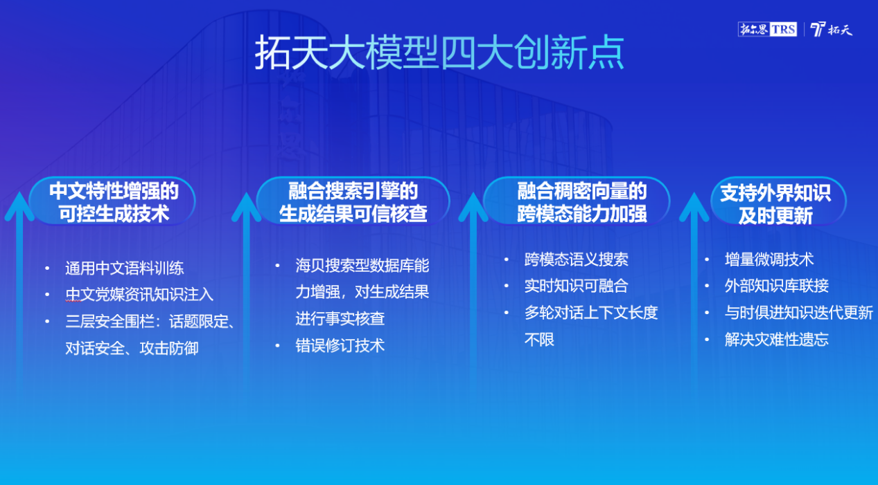 拓天大模型擁有內(nèi)容生成、多輪對(duì)話、語(yǔ)義理解、跨模態(tài)交互、知識(shí)型搜索、邏輯推理、安全合規(guī)、數(shù)學(xué)計(jì)算、編程能力和插件擴(kuò)展十大基礎(chǔ)能力,具有中文特性增強(qiáng)的可控生成技術(shù)、融合搜索引擎的生成結(jié)果可信核查、融合稠密向量的跨模態(tài)能力加強(qiáng)以及支持外界知識(shí)及時(shí)更新四大創(chuàng)新點(diǎn)。