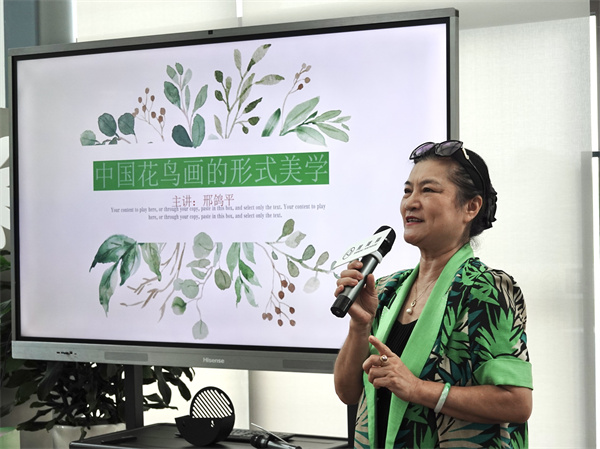 國(guó)家一級(jí)美術(shù)師邢鴿平對(duì)于文藝作品傳承創(chuàng)新、服務(wù)人民深為認(rèn)同。她分享了“中國(guó)花鳥畫的形式美學(xué)”,并講述了自身的學(xué)畫和畫畫的生活故事,在她眼中,世界充滿了色彩、浪漫和創(chuàng)意。現(xiàn)場(chǎng),她展示了自己的作品《秋光爛漫晴方好》《芳菲祥瑞》《如沐春風(fēng)》等,并剖析了畫作中含有的和諧與對(duì)比、對(duì)稱與均衡以及比例關(guān)系。
