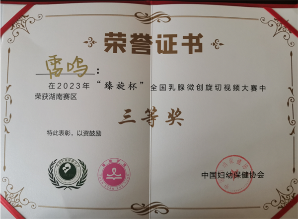 喜訊!衡陽市婦幼保健院乳腺外科雷鳴醫(yī)生榮獲“臻旋杯”全國乳腺微創(chuàng)旋切視頻大賽湖南賽區(qū)“三等獎”