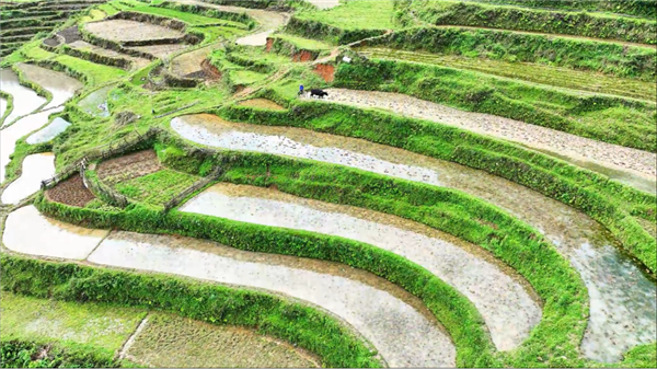 站在山頂極目遠(yuǎn)眺,山下新耕完畢的數(shù)千畝梯田,如鏈似帶,層層疊疊,注滿水的梯田仿佛鑲嵌在大地的一面面明鏡,水光相互倒映,映照出藍(lán)天彩云,靜如止水而又精美絕倫地掛在眼簾,與安靜古樸的村莊相映成趣。