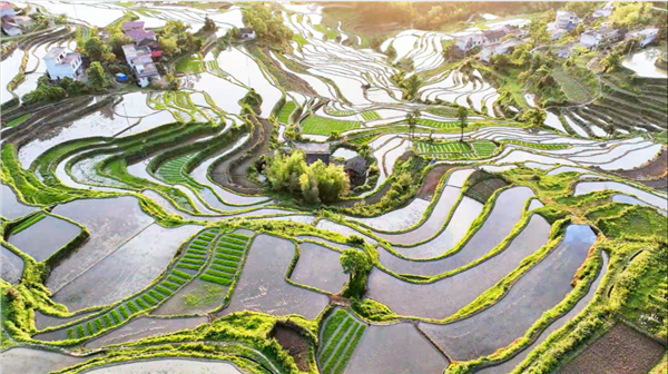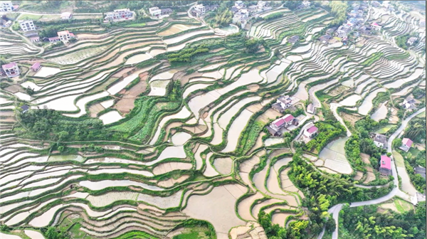 青山環(huán)抱著梯田,鄉(xiāng)村點(diǎn)綴其間,飄逸靈動(dòng),如詩(shī)如畫,共同構(gòu)成一幅生態(tài)和美的鄉(xiāng)村振興新畫卷。