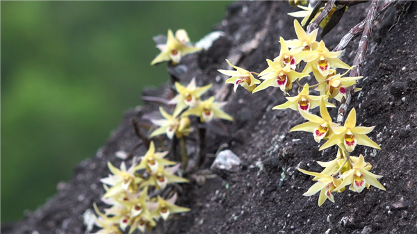在黃背村海拔500米仿野生鐵皮石斛種植基地的崀山崖壁上,一簇簇淡黃色的鐵皮石斛花依附在崖壁表層,根莖緊貼著崖壁,仿佛在聆聽(tīng)大自然的心跳,微風(fēng)輕拂,石斛花朵散發(fā)出淡淡清香。采摘工人在安全繩索的保護(hù)下,貼著懸崖緩緩下降,精心采摘盛開(kāi)的鐵皮石斛花。