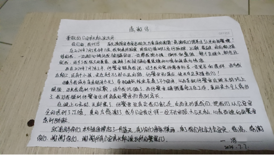 這一封手寫的感謝信是對長航公安派出所工作的感謝,更是對公安工作的認可。下一步,長航公安派出所將不懈努力,繼續(xù)全力辦理好該案件,及時挽回被害人的損失。同時,將在今后的工作中繼續(xù)牢牢堅持以人民為中心的發(fā)展思想,主動擔當作為,用心用情辦好群眾身邊關切的“小事”“小案”,切實守護群眾利益。 (來源:長江航運公安局荊州分局 作者:張奧妮)