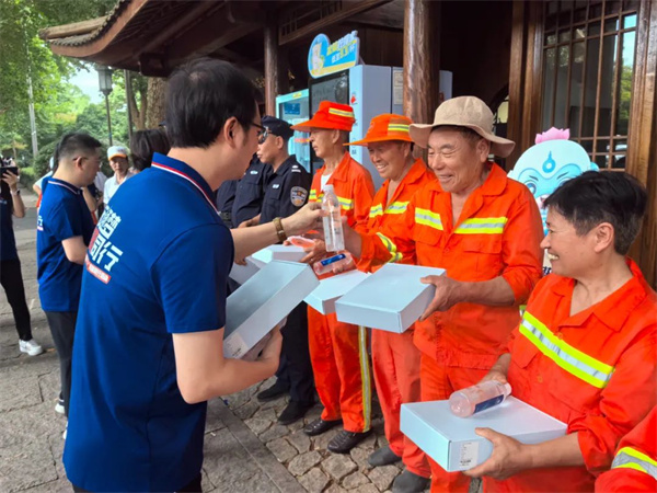 活動(dòng)在岳廟管理處驛站——志愿服務(wù)微笑亭舉行,黨員干部們化身為“藍(lán)衣戰(zhàn)士”,為炎炎夏日中堅(jiān)守崗位的環(huán)衛(wèi)人員、安保人員、售票人員等送上了定制水、降溫冰貼、花露水、防曬帽等清涼用品?;顒?dòng)中,共計(jì)為岳廟管理處管轄范圍西湖核心景區(qū)的工作人員送上了200余份清涼與慰問(wèn)。