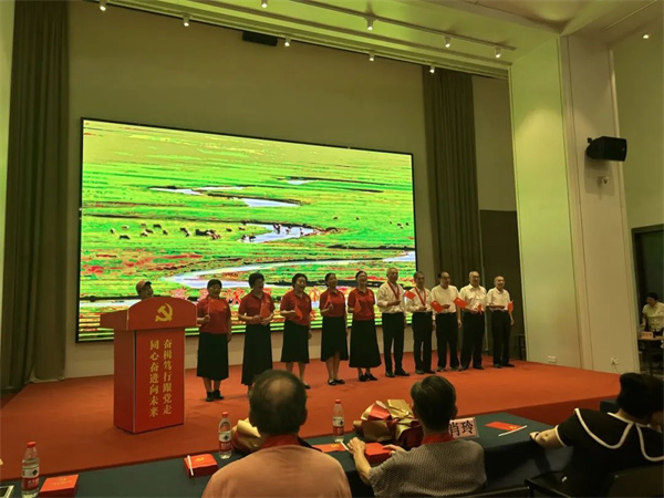 全體黨員在莊嚴(yán)的氛圍下下合唱《我和我的祖國(guó)》,歌聲嘹亮,情感真摯,表達(dá)了對(duì)祖國(guó)的無限熱愛。