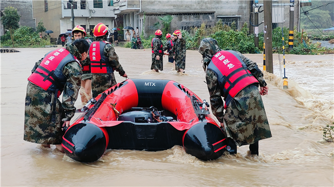面對洶涌洪水,新邵應(yīng)急救援隊伍迅速集結(jié)施救。(劉丈國供圖)