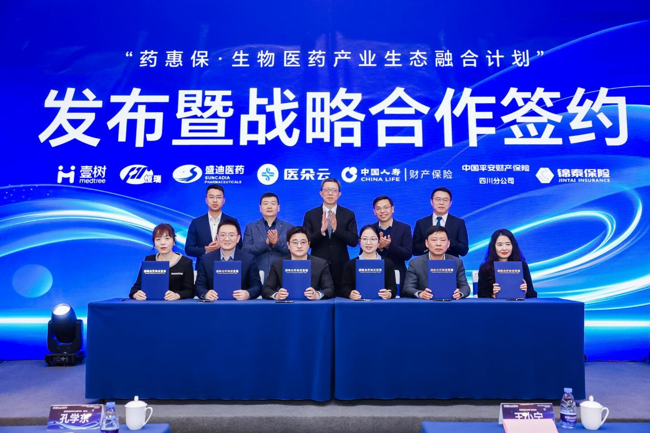 在隨后的簽約儀式中,上海壹樹健康科技有限公司創(chuàng)始人兼CEO宋怡然、成都盛迪醫(yī)藥有限公司副總經(jīng)理兼成都盛迪研究所所長張輝、中國平安財(cái)產(chǎn)保險(xiǎn)股份有限公司四川分公司副總經(jīng)理丁文煜、中國人壽財(cái)產(chǎn)保險(xiǎn)股份有限公司四川省分公司黨委委員兼副總經(jīng)理孫堅(jiān)、錦泰財(cái)產(chǎn)保險(xiǎn)股份有限公司團(tuán)體業(yè)務(wù)運(yùn)營部副總經(jīng)理周薇、蘇州醫(yī)朵云健康股份有限公司B端業(yè)務(wù)部總監(jiān)王勤共同進(jìn)行了“藥惠?!ど镝t(yī)藥產(chǎn)業(yè)生態(tài)融合計(jì)劃”的戰(zhàn)略簽約。此次戰(zhàn)略合作標(biāo)志著多方力量將各自發(fā)揮優(yōu)勢,彼此賦能,仰賴區(qū)域優(yōu)越、政策支持、和學(xué)界資源,目標(biāo)直指共同推動生物醫(yī)藥產(chǎn)業(yè)的生態(tài)共創(chuàng)和產(chǎn)業(yè)革新。