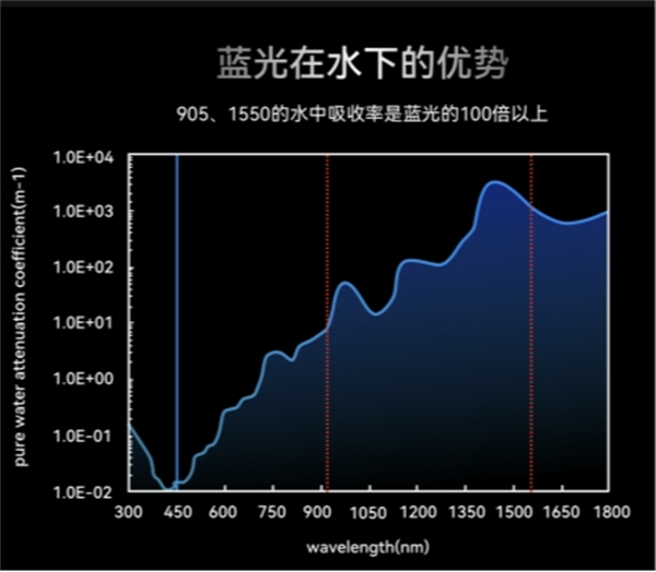 不同波長在純水中的衰減情況,450nm左右藍(lán)光在水下抗衰減最佳