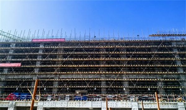此次封頂?shù)脑炝?蚣転楝F(xiàn)澆混凝土結(jié)構(gòu),總高48米,占地面積逾7600平方米,是項目體量最大、技術(shù)難度最高的土建單體。建筑共設五層,局部模板支撐高度接近15米,對模板體系的穩(wěn)定性和安全管理構(gòu)成嚴峻挑戰(zhàn)。項目團隊通過優(yōu)化支撐方案、強化過程管控,確保了主體結(jié)構(gòu)施工的安全與精準。