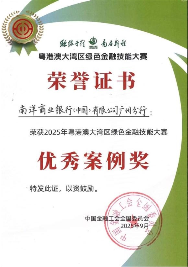 南洋商業(yè)銀行榮獲“大灣區(qū)綠色金融技能大賽”優(yōu)秀案例獎(jiǎng)
