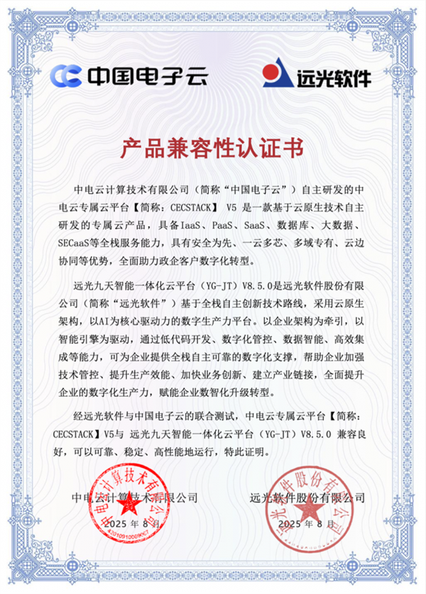 共建數(shù)智新生態(tài),遠(yuǎn)光軟件攜手中國(guó)電子云完成產(chǎn)品兼容互認(rèn)證