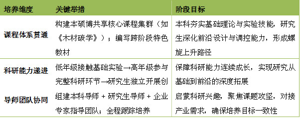 東北林業(yè)大學(xué)林業(yè)工程學(xué)科深刻認(rèn)識(shí)到,研究生階段的高質(zhì)量創(chuàng)新離不開本科時(shí)期的扎實(shí)積累。林業(yè)工程成棟班作為本碩博貫通培養(yǎng)的標(biāo)桿,通過“課程體系貫通、科研能力遞進(jìn)、導(dǎo)師團(tuán)隊(duì)協(xié)同”的一體化機(jī)制,實(shí)現(xiàn)了從本科到研究生階段的平滑過渡與能力躍升。