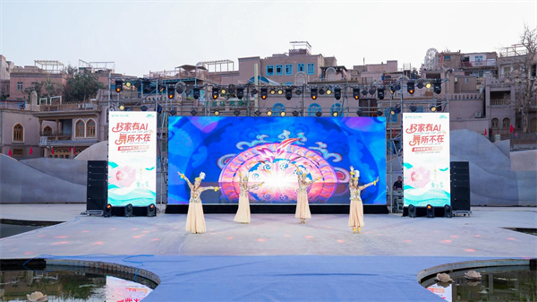 活動深度融合新疆民族藝術(shù)與現(xiàn)代數(shù)字技術(shù),通過多元形式將“文化潤疆”“鄉(xiāng)村振興”與企業(yè)服務(wù)實踐緊密結(jié)合,展現(xiàn)了邊疆群眾對美好生活的向往。活動現(xiàn)場,喀什古城洋溢著歡樂氛圍。新疆民族歌舞奏響歡快節(jié)奏,臺下觀眾紛紛隨之律動,民族樂器演奏贏得陣陣喝彩,濃郁的地域文化魅力盡顯。前期線上征集的7組“麥西來甫TV趣味家庭展演賽”嘉賓,以精彩歌舞獻上視聽盛宴。百萬粉絲博主“新疆石榴哥”艾尼、阿杰及“大玉的侶途”親臨現(xiàn)場參與互動,多輪抽獎送出華為平板電腦、兒童手表等豐厚獎品,持續(xù)點燃現(xiàn)場熱情,活動不僅為當(dāng)?shù)厝罕姶罱斯参幕故酒脚_,更傳遞出“民族團結(jié)一家親”溫情。