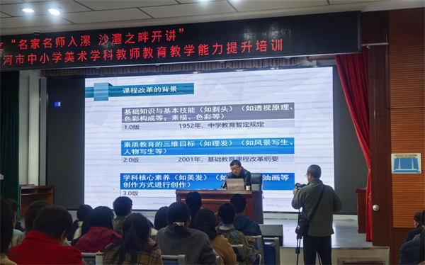 培訓(xùn)環(huán)節(jié)中,省教研室馬飲川主任圍繞新課標(biāo)展開(kāi)深入解讀。他系統(tǒng)闡釋了新課標(biāo)的內(nèi)涵與改革重點(diǎn),并結(jié)合實(shí)際教學(xué)案例,指出教師在落實(shí)新課標(biāo)過(guò)程中應(yīng)注意的問(wèn)題,為參訓(xùn)教師提供了具有實(shí)踐指導(dǎo)意義的教學(xué)思路。馬飲川的講述貫通古今,妙趣橫生,他以美術(shù)課標(biāo)為原點(diǎn),穿梭于不同知識(shí)領(lǐng)域,用一個(gè)個(gè)引人入勝的故事,構(gòu)建出一個(gè)廣闊而有趣的知識(shí)圖景,實(shí)現(xiàn)了教學(xué)理念的升華。