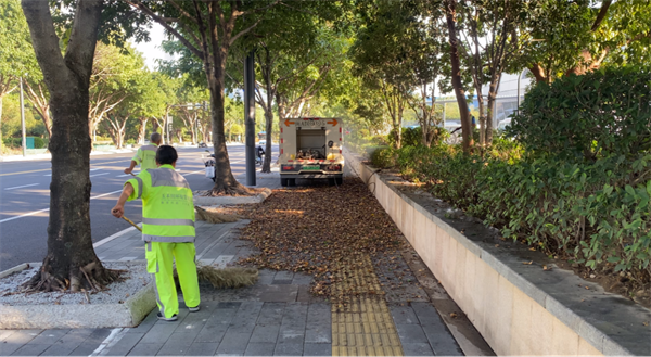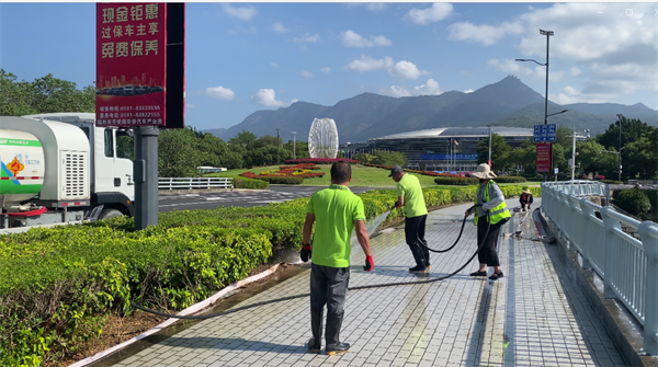為確保會議期間環(huán)境品質(zhì),玉禾田提前一周啟動專項整治行動。針對會展中心周邊綠化帶,公司采用“人工+機械”組合模式,出動水車進行人工抱管作同時安排環(huán)衛(wèi)工人配合清掃,對沖洗出的落葉垃圾進行“地毯式”清理。