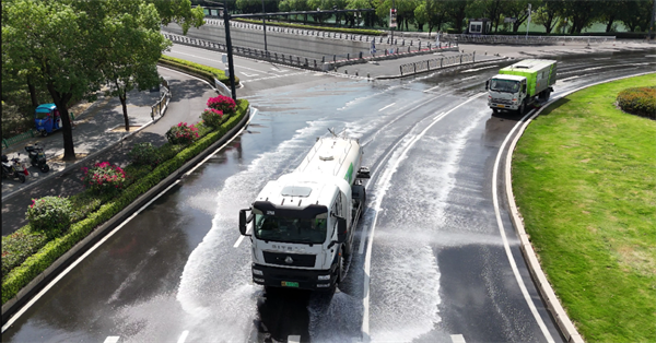 在路面清潔環(huán)節(jié),玉禾田強化機械力量,安排水車、機掃車循環(huán)作業(yè),并安排現(xiàn)場員工手持高壓水槍對機動車道、非機動車道進行逐段沖洗,提升道路潔凈度。