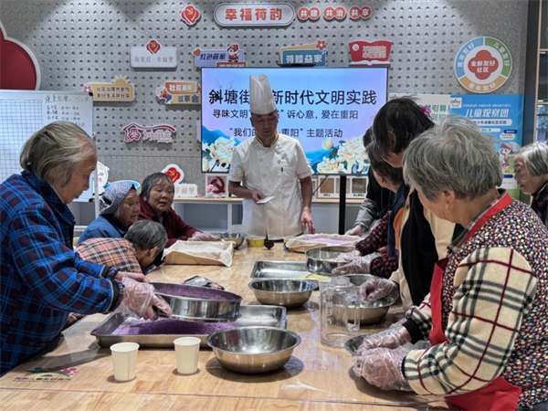 為讓老年人感受傳統(tǒng)節(jié)日魅力,社區(qū)精心策劃兩場民俗體驗活動。在“流沙映重陽,巧手傳心意”流沙畫制作現場,老人和孩子們在紅色管家志愿者的指導下手持工具,將彩色細沙層層鋪疊,在玻璃畫布上勾勒出山水、重陽糕等吉祥圖案,一幅幅靈動的作品既承載著對節(jié)日的祝福,也讓老人們體驗到手工創(chuàng)作的樂趣?!啊狻V心意,愛在重陽”活動則聚焦傳統(tǒng)美食,社區(qū)準備好糯米粉、紅棗、豆沙等食材,老人們圍坐在一起揉面、塑形、蒸制,陣陣米香彌漫現場。大家一邊制作重陽糕,一邊分享兒時過節(jié)的記憶,在動手實踐中“尋味”重陽文化,更在互動交流中傳遞鄰里溫情。