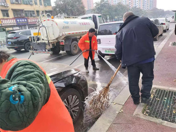 工作人員結(jié)合街道道路實(shí)際狀況,對主次干道、工地周邊及污染較重道路的路面、道沿灰?guī)Ш头e塵進(jìn)行全面沖洗,有效防止揚(yáng)塵污染。灑水車作業(yè)時(shí),環(huán)衛(wèi)工人同步跟掃,及時(shí)清理路面積水,避免給群眾出行造成不便。