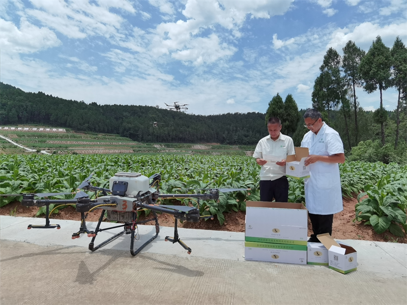 劍閣縣龍源鎮(zhèn)興泉村煙葉技術員使用無人機進行病蟲害統(tǒng)防統(tǒng)治