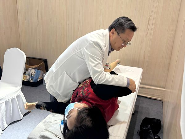 展會現(xiàn)場,以韓國棟為代表的2名參展醫(yī)師身著干練短款白大衣,以專業(yè)的姿態(tài)向國內(nèi)外觀展群眾全方位展示我院中朝醫(yī)藥特色技術(shù)。作為“朝醫(yī)韓氏懸解脈法流派”的傳承者,韓國棟憑借精湛的脈法技藝為群眾精準(zhǔn)把脈,其高超的診療水平贏得了現(xiàn)場群眾的一致好評,不少受益群眾紛紛豎起大拇指點(diǎn)贊。與此同時,團(tuán)隊的“龍氏治脊推拿正骨流派”特色技術(shù),針對頸椎病、腰腿痛等常見骨傷科疾病為群眾提供現(xiàn)場診療服務(wù),實(shí)操性強(qiáng)、療效顯著的特點(diǎn)讓觀展群眾駐足稱贊。