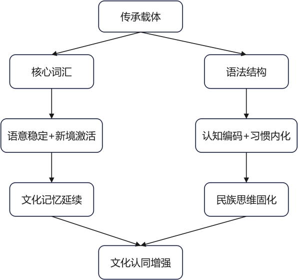 語(yǔ)法作為語(yǔ)言深層結(jié)構(gòu)編碼著民族特有的認(rèn)知圖式與思維方式,構(gòu)成文化傳承最隱蔽也最持久的機(jī)制,漢語(yǔ)意合語(yǔ)法體現(xiàn)“天人合一”的整體性思維,話題優(yōu)先的語(yǔ)序反映關(guān)系本位的社會(huì)結(jié)構(gòu),時(shí)間標(biāo)記的靈活性對(duì)應(yīng)循環(huán)時(shí)間觀。這些語(yǔ)法規(guī)則在語(yǔ)言習(xí)得過程中被內(nèi)化為無意識(shí)的認(rèn)知習(xí)慣,使用者在遵循語(yǔ)法規(guī)范的同時(shí)也在復(fù)制著傳統(tǒng)文化的思維模式,與詞匯層面的顯性傳承不同,語(yǔ)法結(jié)構(gòu)的傳承具有強(qiáng)制性與不可見性,即使在語(yǔ)言劇烈變革時(shí)期(如白話文運(yùn)動(dòng)),語(yǔ)法框架仍保持高度穩(wěn)定,成為文化認(rèn)同的深層支撐(見圖1)。