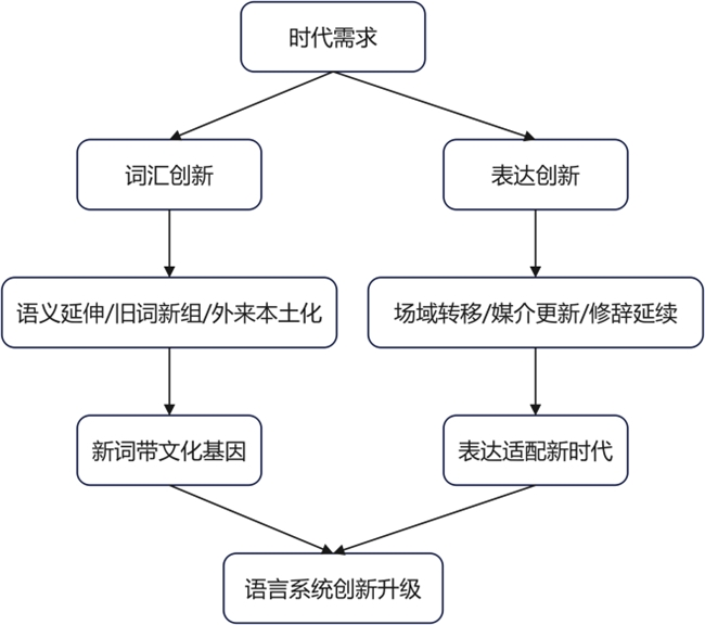 表達(dá)方式的創(chuàng)新反映話語(yǔ)實(shí)踐對(duì)社會(huì)變遷的能動(dòng)回應(yīng),通過話語(yǔ)范式的重構(gòu)實(shí)現(xiàn)文化的時(shí)代性轉(zhuǎn)化,文言到白話的轉(zhuǎn)變是傳播方式民主化的語(yǔ)言體現(xiàn),網(wǎng)絡(luò)流行語(yǔ)的興起則是青年文化對(duì)傳統(tǒng)修辭的解構(gòu)性繼承,看似顛覆性的新表達(dá)(如“躺平”“內(nèi)卷”)實(shí)則繼承著漢語(yǔ)含蓄,隱喻與重語(yǔ)境的修辭傳統(tǒng),只是話語(yǔ)場(chǎng)域從廟堂轉(zhuǎn)向民間與從書面轉(zhuǎn)向口語(yǔ)。短視頻時(shí)代的“梗文化”雖呈現(xiàn)碎片化特征卻延續(xù)著漢語(yǔ)“言簡(jiǎn)意賅”的表達(dá)美學(xué),這表明表達(dá)創(chuàng)新是傳統(tǒng)修辭原則在新媒介與新場(chǎng)景中的形式轉(zhuǎn)換,創(chuàng)新過程本身就是傳統(tǒng)文化適應(yīng)時(shí)代需求的轉(zhuǎn)化過程,二者構(gòu)成辯證統(tǒng)一關(guān)系(見圖2)。