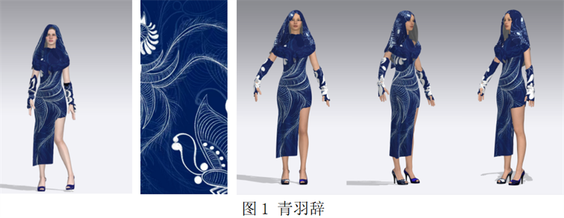 學(xué)生實(shí)踐項(xiàng)目《青羽辭》(如圖1)聚焦于非遺蠟染技藝的當(dāng)代創(chuàng)新。通過(guò)系統(tǒng)性研究工藝技法與風(fēng)格元素(梳理“點(diǎn)蠟-染色-脫蠟”工藝流程及水墨藍(lán)調(diào)原理),整合跨平臺(tái)素材與紋樣(從小紅書提取孔雀羽毛紋樣,匹配站酷平臺(tái)改良旗袍與套裝剪裁實(shí)現(xiàn)紋樣與服裝結(jié)構(gòu)深度適配),在CLO3D平臺(tái)完成全流程數(shù)字化(虛擬模特搭建、2D紙樣繪制、材質(zhì)參數(shù)調(diào)試還原蠟染肌理),并構(gòu)建風(fēng)格化虛擬舞臺(tái)。這一系列實(shí)踐形成了“文化挖掘-數(shù)字轉(zhuǎn)譯-場(chǎng)景呈現(xiàn)”完整鏈條,為傳統(tǒng)蠟染文化的活態(tài)傳承與數(shù)字化傳播提供了可借鑒的范式。
