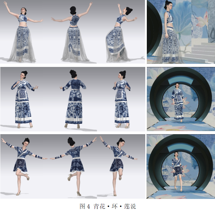 學(xué)生實(shí)踐項(xiàng)目《青花·環(huán)·蓮說(shuō)》(如圖4)以蠟染非遺為核心,通過(guò)跨平臺(tái)素材采集與工藝特征分析,創(chuàng)新性地將蠟染的“實(shí)線條”藝術(shù)特質(zhì)與扎染的“虛印染”特性相融合,打造出“規(guī)整紋樣+自然肌理”的對(duì)比效果。制作階段運(yùn)用PHOTOSHOP、CLO3D數(shù)字工具實(shí)現(xiàn)全流程數(shù)字化,精準(zhǔn)復(fù)刻蠟染的肌理質(zhì)感,同時(shí)將傳統(tǒng)文化轉(zhuǎn)化為多元當(dāng)代風(fēng)格。展示階段采用中式虛擬T臺(tái),將文化意象與數(shù)字傳播深度融合,最終形成“文化挖掘-數(shù)字轉(zhuǎn)譯-情境呈現(xiàn)”的完整實(shí)踐鏈條。