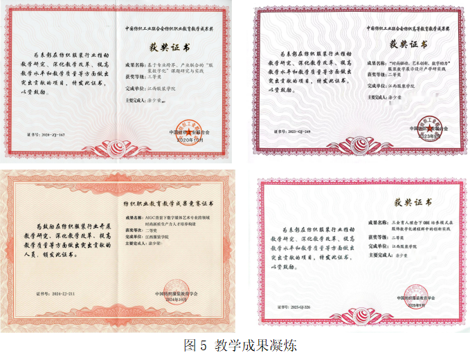 課程群教學(xué)成果先后四次獲得教學(xué)成果獎(jiǎng)?wù)J定(如圖5)?;?020—2025年服飾數(shù)字化課程群的教學(xué)實(shí)踐經(jīng)驗(yàn),我們提煉出數(shù)字時(shí)代文化遺產(chǎn)活態(tài)傳承的三維理論模型:第一,文化內(nèi)核驅(qū)動(dòng)型——以非遺文化脈絡(luò)和符號(hào)寓意為核心,確保技術(shù)應(yīng)用忠實(shí)于文化本質(zhì);第二,技術(shù)工具驅(qū)動(dòng)型——運(yùn)用數(shù)字建模、虛擬展示等技術(shù)手段,實(shí)現(xiàn)文化元素的精準(zhǔn)轉(zhuǎn)譯與動(dòng)態(tài)傳播;第三,社會(huì)需求驅(qū)動(dòng)型——契合地方企業(yè)與文化機(jī)構(gòu)的市場(chǎng)推廣和文化傳播需求,將數(shù)字資產(chǎn)轉(zhuǎn)化為具有市場(chǎng)吸引力的文化產(chǎn)品,從而建立“保護(hù)—傳承—?jiǎng)?chuàng)新”的良性循環(huán)。該模型的核心在于通過(guò)教育領(lǐng)域的跨學(xué)科整合,打通從遺產(chǎn)“保護(hù)”到“傳播”再到最終“創(chuàng)新”的完整鏈條。這一模型為數(shù)字時(shí)代的文化遺產(chǎn)活態(tài)傳承提供了系統(tǒng)性解決方案,涵蓋“教育賦能、技術(shù)支撐、市場(chǎng)轉(zhuǎn)化”三大維度。