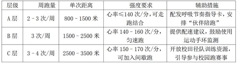 在2023級、2024級共12個專業(yè)試點“體質(zhì)分層健身跑”教學(xué)改革,形成一套可操作的實施框架。