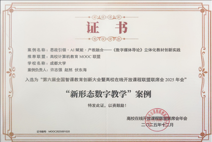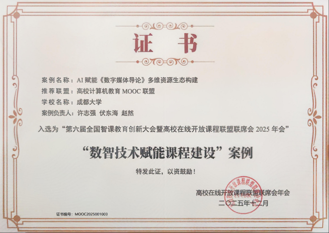 本次大會(huì)為引領(lǐng)慕課智慧化升級(jí),正式發(fā)布了“智慧慕課行動(dòng)宣言”,呼吁全國(guó)高校共同推進(jìn)慕課智能化升級(jí),標(biāo)志著智慧教育進(jìn)入新階段。經(jīng)全國(guó)范圍嚴(yán)格遴選,成都大學(xué)中國(guó)-東盟藝術(shù)學(xué)院影視與動(dòng)畫學(xué)院副院長(zhǎng)許志強(qiáng)教授團(tuán)隊(duì)主持的《AI賦能〈數(shù)字媒體導(dǎo)論〉多維資源生態(tài)構(gòu)建》《思政引領(lǐng)?AI賦能?產(chǎn)教融合——〈數(shù)字媒體導(dǎo)論〉立體化教材創(chuàng)新實(shí)踐》兩項(xiàng)案例脫穎而出,分別榮獲“數(shù)智技術(shù)賦能課程建設(shè)”與“新形態(tài)數(shù)字教學(xué)”優(yōu)秀案例。這一成績(jī)不僅代表學(xué)校在教育數(shù)字化領(lǐng)域取得新突破,更體現(xiàn)了其在信息技術(shù)與教學(xué)深度融合方面的先行探索與實(shí)踐成效。